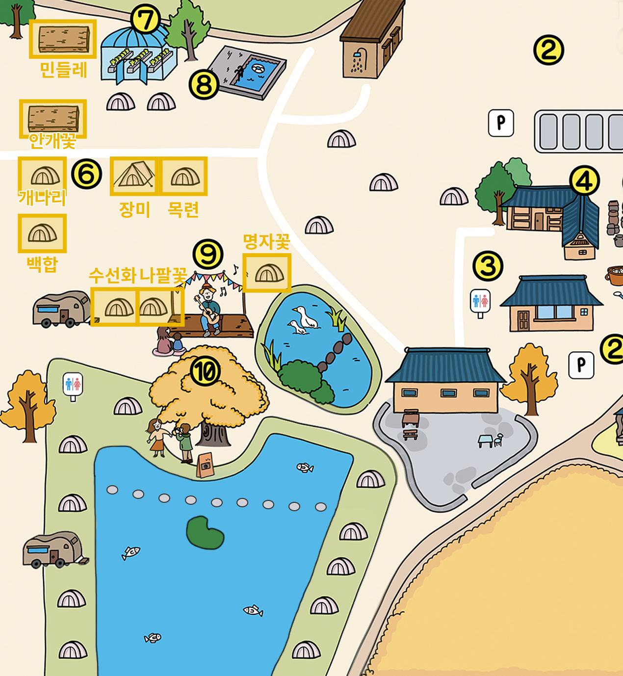 | 잔디 데크 | 개나리, 백합, 장미, 목련, 명자꽃, 수선화, 나팔꽃 |